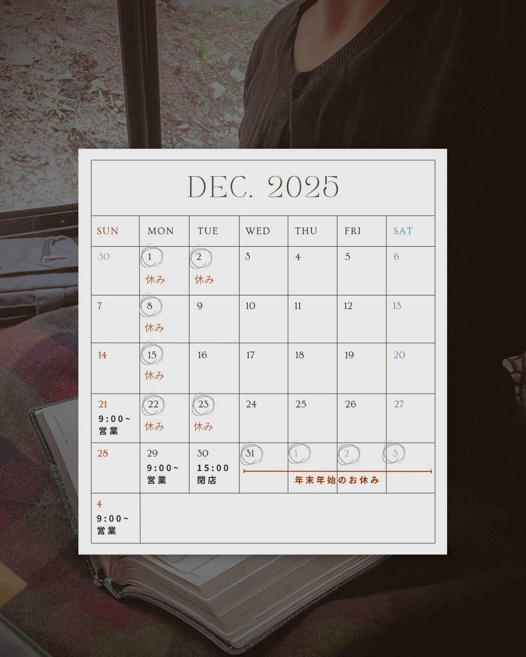 通常では第3日曜日はお休みをいただいておりますが、12月21日(日)においては通常営業となります。また、12月29日の月曜日も営業いたします。